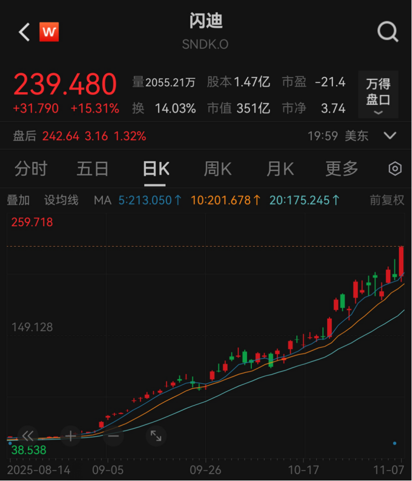 在美股市場上,閃迪11月7日因數據中心存儲芯片銷售強勁而大漲超15%,股價再創歷史新高。閃迪表示,預計NAND產品供不應求持續至2026年底,數據中心將成為NAND最大應用市場。