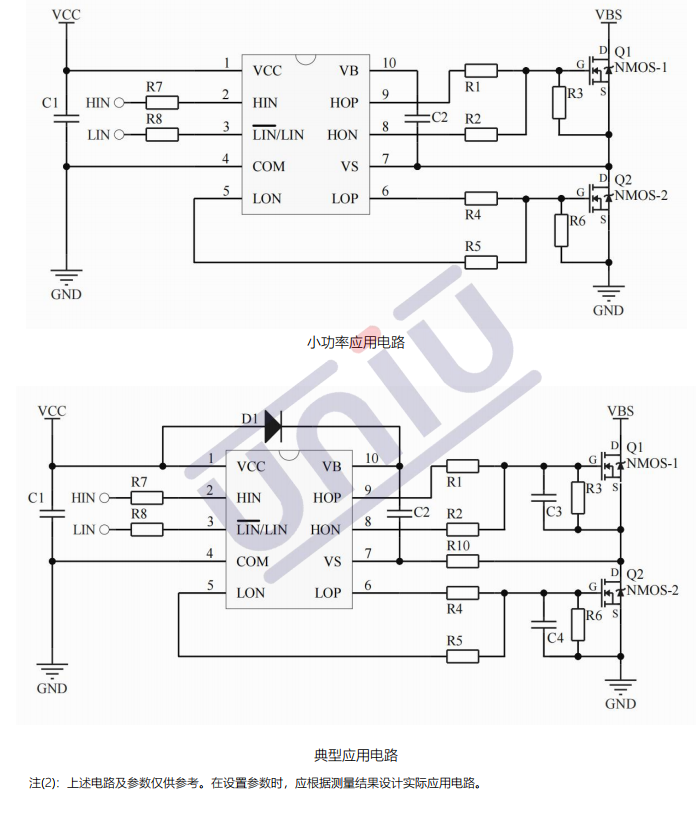 •主要特點: 集成自舉二極管(1) ;高端懸浮自舉設計;最高工作電壓可達+300V ;負瞬態電壓承受能力;支持柵極驅動電壓從9到20V ;VCC/VBS欠壓保護(UVLO) ;兼容3.3V,5V輸入邏輯 ;內置直通防止和死區時間;芯片傳輸延時特性