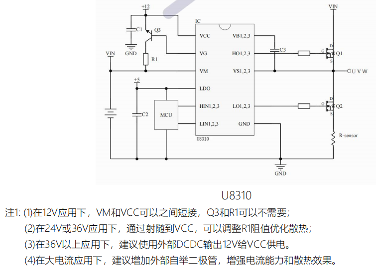 U8310是一款耐壓為120V的集成三相全橋柵極驅動器,適合于三相電機應用中高速功率MOSFET和IGBT的柵極驅動,同時也集成了12V LDO控制電路和MCU的供電5.0V LDO,集成內部自舉二極管,簡化了整個供電系統。U8310內置低側電源和高側電源欠壓(UVLO)保護功能,防止功率管在過低的電壓下工作,提高效率。U8310輸入腳兼容3.3-5.0V輸入邏輯,集成防穿通死區時間為150ns,驅動能力為+2.0A/-2.5A。U8310集成共模噪聲消除技術使得高邊驅動器在高dv/dt噪聲環境能穩定工作,并且使芯片具有寬范的負瞬態電壓忍受能力。